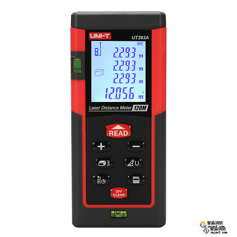 UT393A激光測距儀。具有120米測量范圍,可以滿足長距離、測層高的面積測量。儀表預設四種利用勾股定理測量三角形單邊距離模式,方便用戶在特定復雜環境下(如:被測物體有遮擋或沒有有效的反射面)進行間接測量; 放樣功能,測量某已知點坐標位置或由已知點組成的直線方位,應用于裝潢地磚之間距離計算與園林樹與樹之間距離計算。新創意的人體工程學設計,讓測量工作變得更加容易